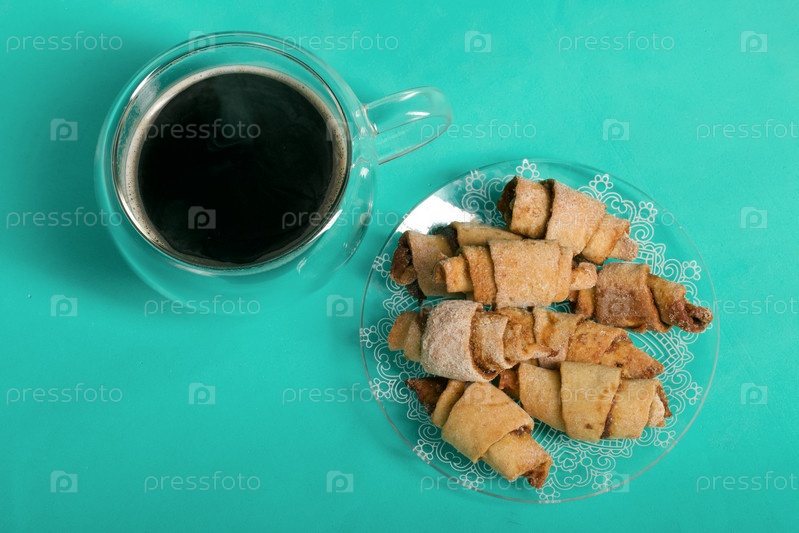 Рулетики с корицей. Круассаны с корицей. Они лежат на блюдце. Рядом стоит чашка кофе. Светло-зеленый фон. Снято крупным планом