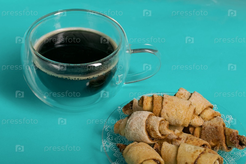 Рулетики с корицей. Круассаны с корицей. Они лежат на блюдце. Рядом стоит чашка кофе. Светло-зеленый фон. Снято крупным планом