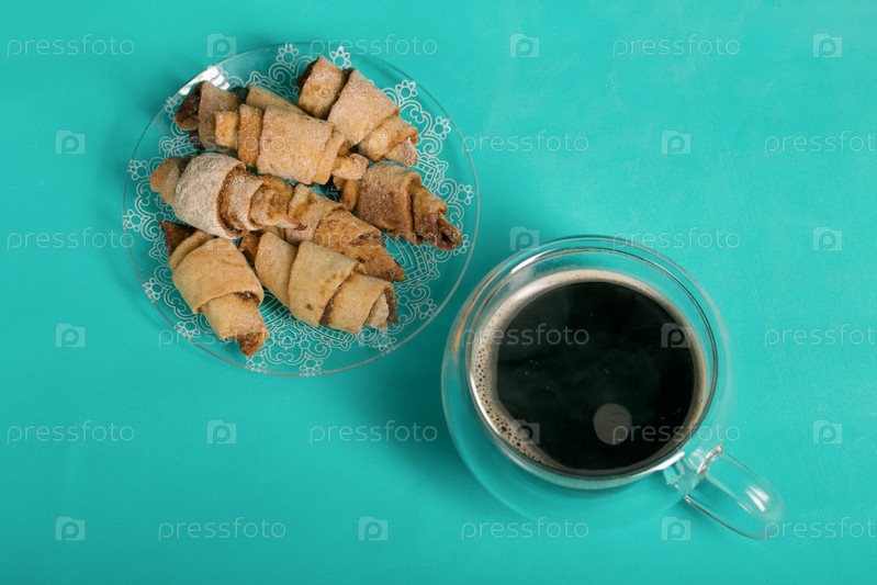 Рулетики с корицей. Круассаны с корицей. Они лежат на блюдце. Рядом стоит чашка кофе. Светло-зеленый фон. Снято крупным планом