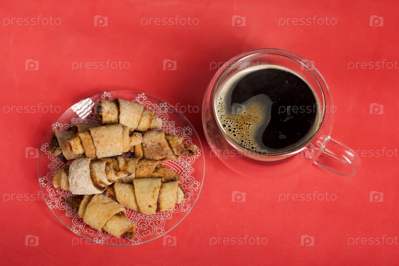 Круассаны с корицей. Рулетики с корицей. Они лежат на блюдце. Рядом стоит чашка кофе. Фон розовый. Снято крупным планом