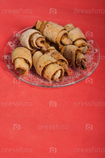 Круассаны с корицей. Рулетики с корицей. Они лежат на блюдце. Фон розовый. Снято крупным планом