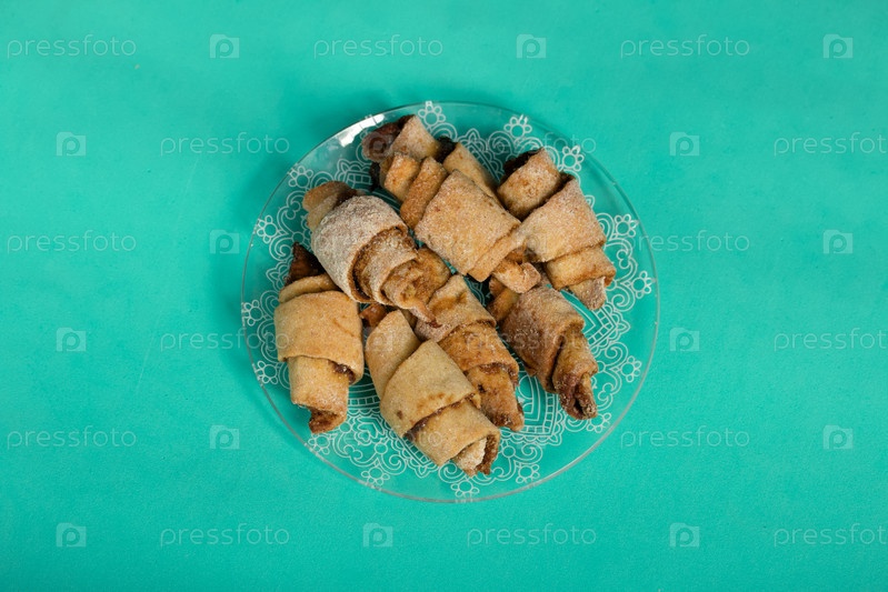Рулетики с корицей. Круассаны с корицей. Они лежат на блюдце. Светло-зеленый фон. Снято крупным планом
