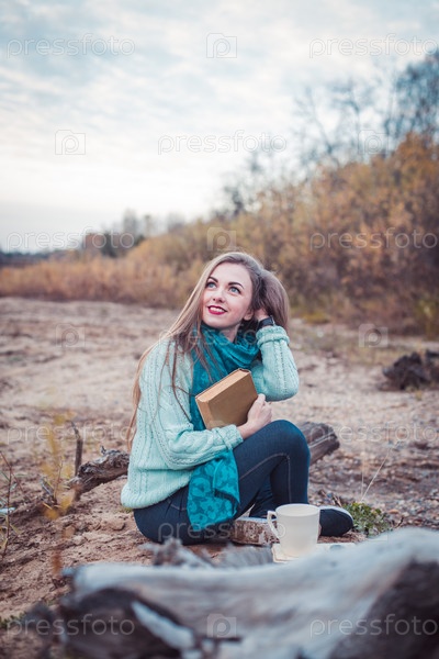 Модель сидит на берегу реки