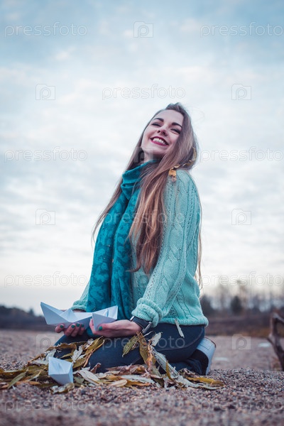 Модель сидит на берегу реки