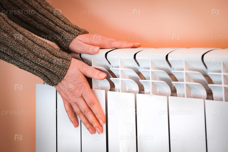 Женские руки, термостат, свитер, согревающие себя теплой батареей. Концепция стоимости услуг отопления, повышение цен на коммунальные услуги