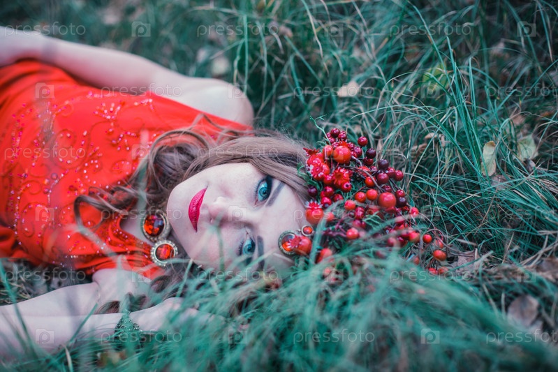 Модель лежит на траве
