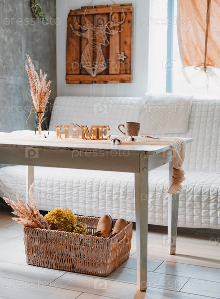 Сухоцветы колоски пампас ваза-подставка кружка лампа белая винтажная скатерть завязанная узлами, домашний интерьер минималистская эстетика. Уютный современный дизайн кухни-столовой гостиной. покраска деревянных досок