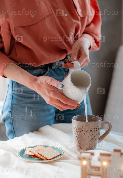 Молодая современная женщина на кухне за столом наливает молоко в чашку во время утреннего завтрака. Яркий интерьер в деревенском стиле