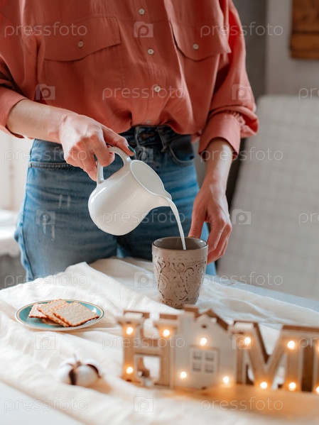 Молодая современная женщина на кухне за столом наливает молоко в чашку во время утреннего завтрака. Яркий интерьер в деревенском стиле