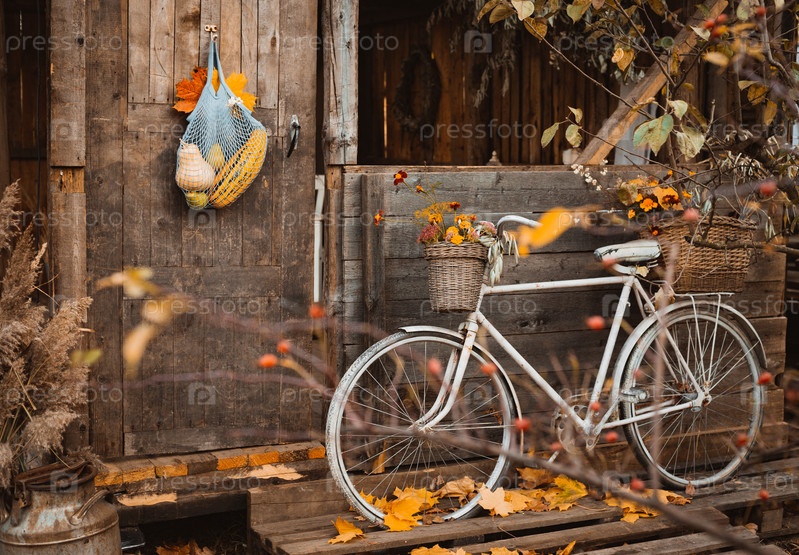 Винтажный велосипед, опирающийся на деревянную стену старого атмосферного загородного дома в прекрасный осенний день