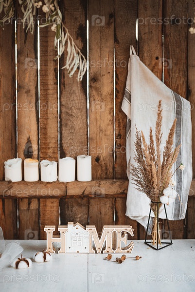 Белый старинный стол с декоративной деревянной надписью HOME рядом со стулом с желтой тыквой осенью и полным урожаем