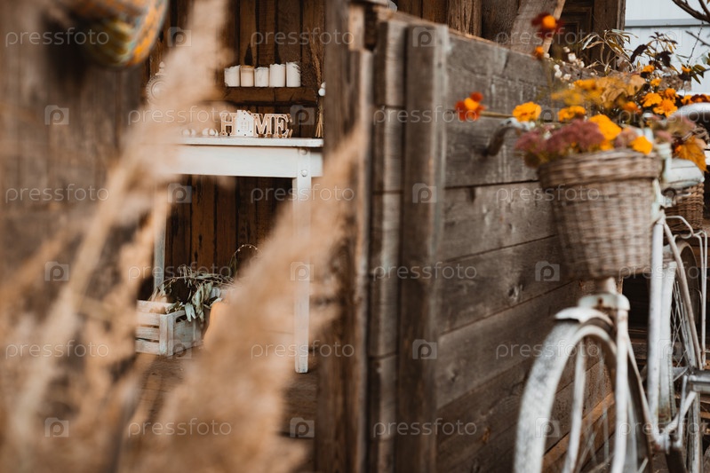 Осеннее время. Винтажный велосипед с яркими цветами в корзине, опирающийся на деревянную стену старого атмосферного загородного дома в осенний сезон, авоська с осенним урожаем висит на двери