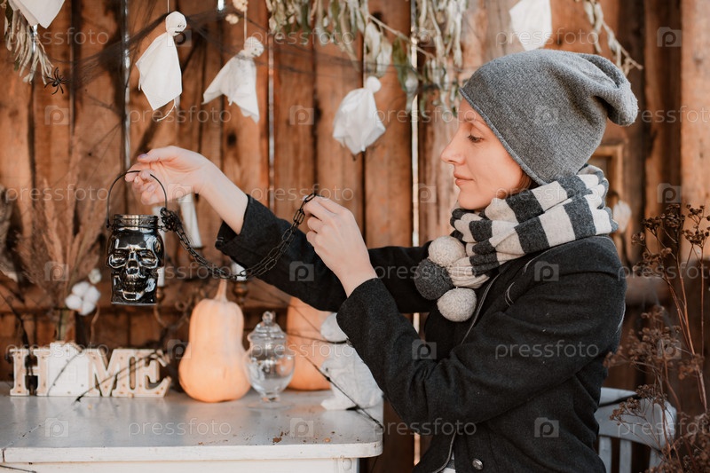 Идеи декора на Хэллоуин. Молодая женщина сидит за столом на террасе старого деревянного дома, украшенной тыквами, свечами и паутиной, женщина в рваных колготках трогает фальшивого призрака, свисающего с потолка