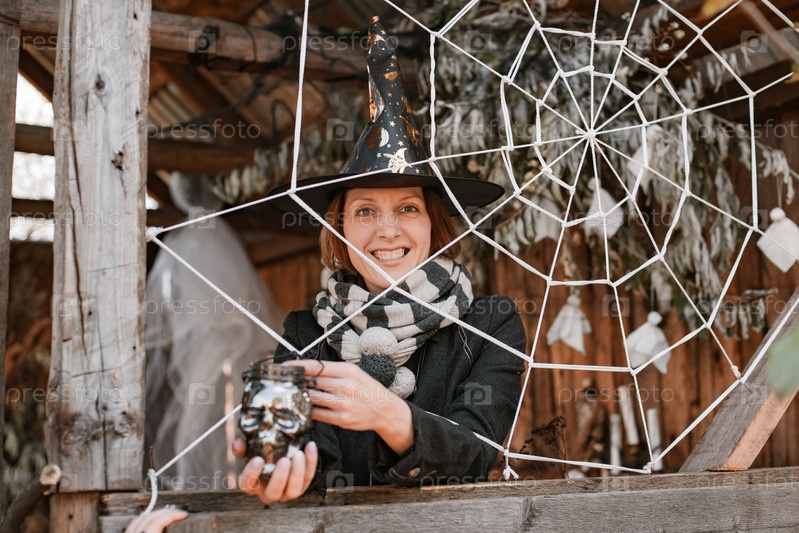 Женщина в маскарадном костюме черной ведьмы на Хэллоуин с подсвечником в виде черепа в руке делает жуткое лицо и притворяется, что застряла в паутине, стоя внутри старого деревянного дома в холодный осенний день