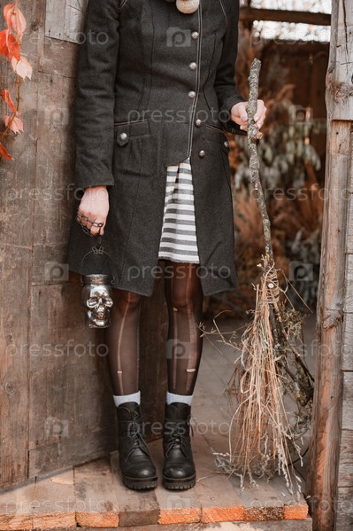 Обрезанный снимок женщины-ведьмы в черных рваных колготках и сапогах, держащей подсвечник из черепа и метлу, стоящей на пороге старого деревянного дома во время праздника Хэллоуин в осенний сезон