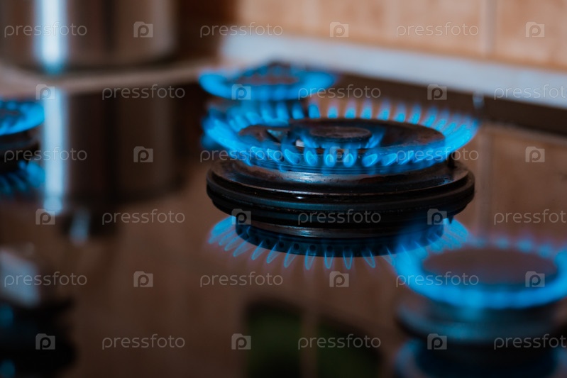 Современная кухонная плита с голубым пламенем горит