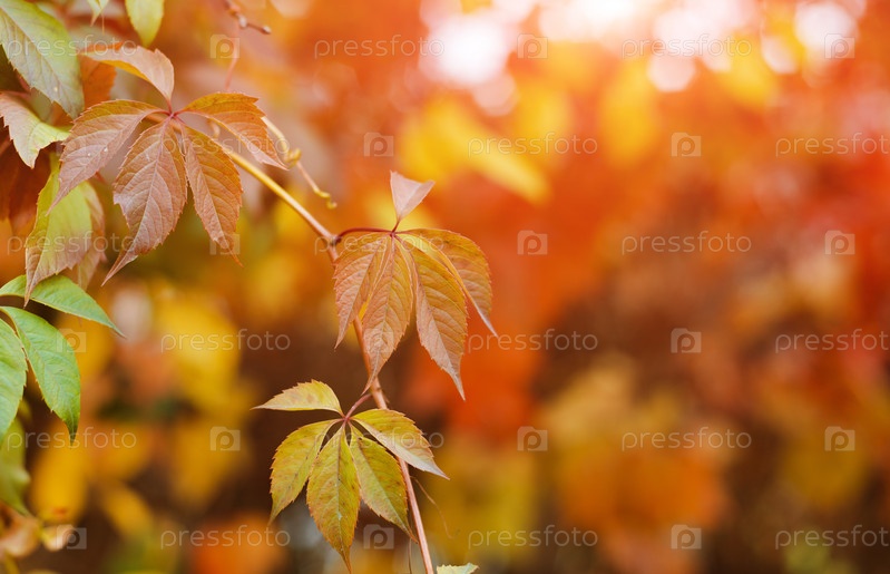 Осенний фон с красочными красными и желтыми листьями вьюнка с размытым свободным пространством
