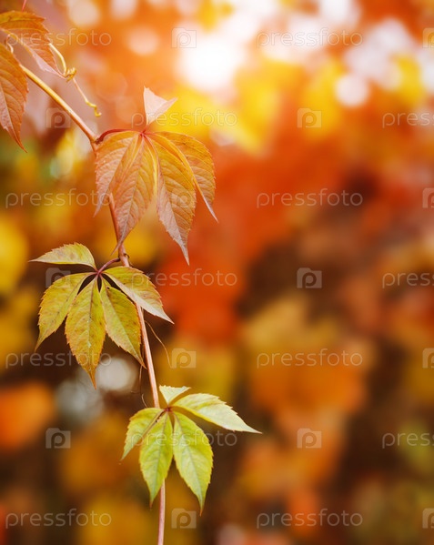 Осенний фон с красочными красными и желтыми листьями вьюнка с размытым свободным пространством