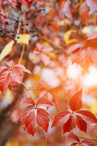 Осенний фон с красочными красными и желтыми листьями вьюнка с размытым солнечным светом в свободном пространстве