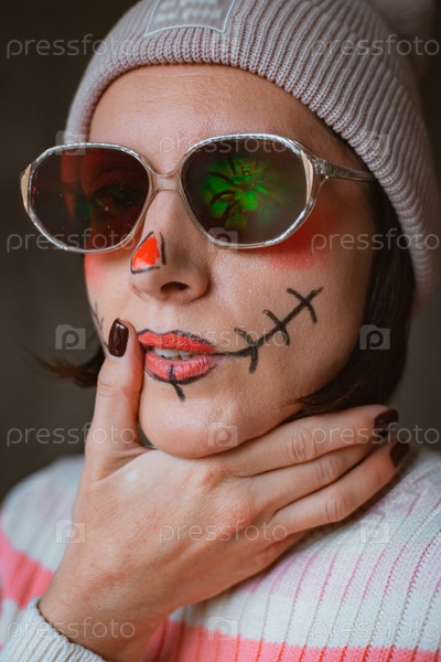 Наглый ужасный хипстерский макияж на хэллоуин в очках и шляпе с нарисованным шрамом на рту, современная мода