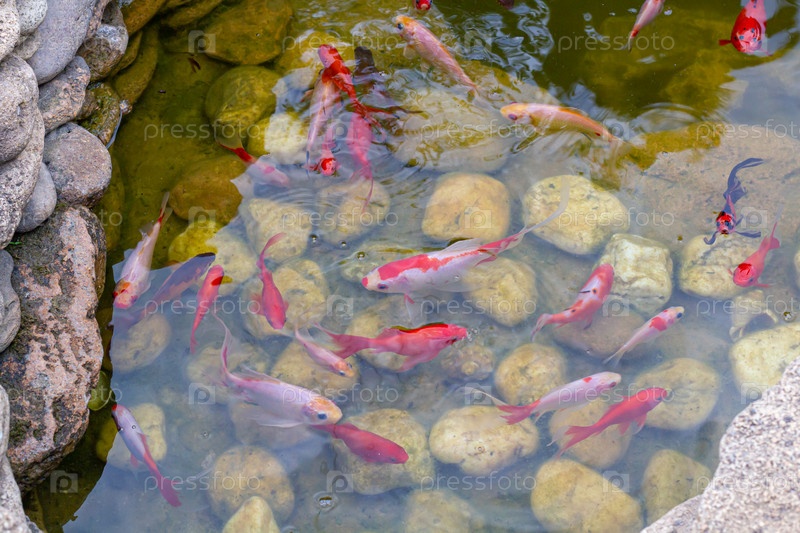 Красочные декоративные рыбы плавают в искусственном пруду, вид сверху