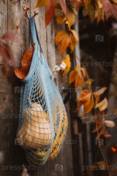 Сумка для покупок с осенним урожаем висит на старой деревенской деревянной двери
