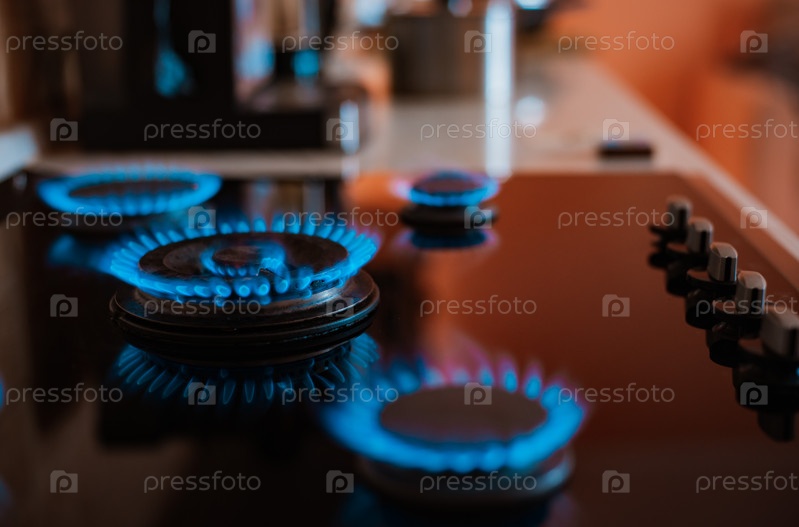 Современная кухонная плита с голубым пламенем горит