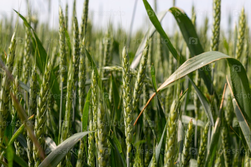 Пшеничное поле, красивый пейзаж, зеленая трава и голубое небо с облаками, натуральный продукт