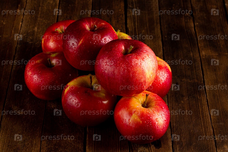 Свежие спелые красные яблоки на деревянном столе, вид сбоку, деревенский стиль