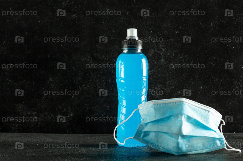 Бутылка изотонического энергетического напитка на темном фоне, освежающий напиток