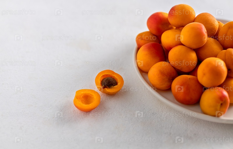 Спелые абрикосы в тарелке на каменном фоне