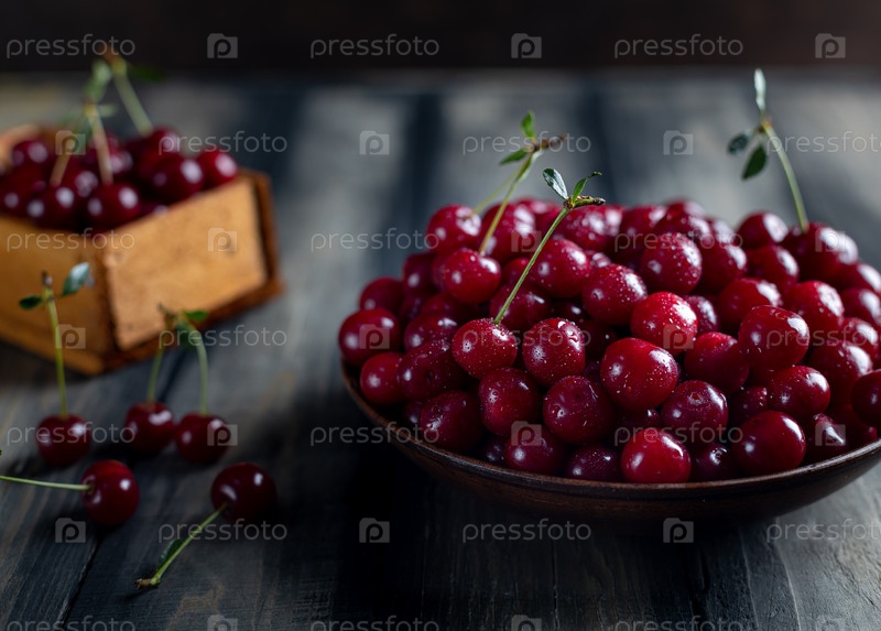 Спелые вишни в тарелке на деревянном столе