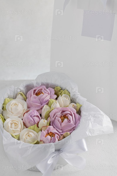 Зефирный букет цветов в подарочной коробке на светлом фоне, вид сверху, праздничная концепция, День святого Валентина
