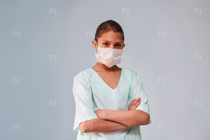 В кадр смотрит молодая медсестра или ассистент в медицинской одежде и маске