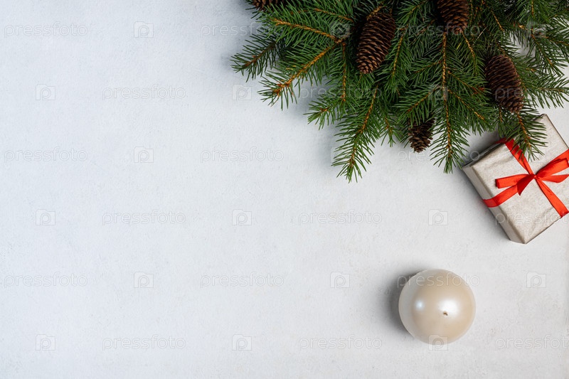 Тема зимних праздников – подарки с елочными украшениями и елкой. вид сверху. копия пространства, баннера, открытки