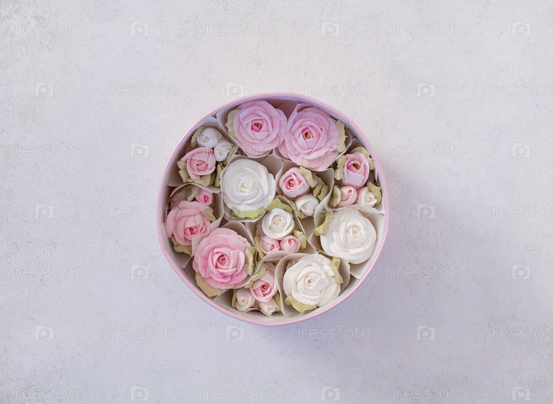 Зефирный букет цветов в розовой коробке на светлом фоне, вид сверху, пространство для копирования, концепция праздника