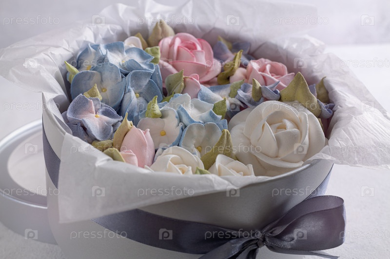 Зефирный букет цветов в розовой коробке на светлом фоне, праздничная концепция