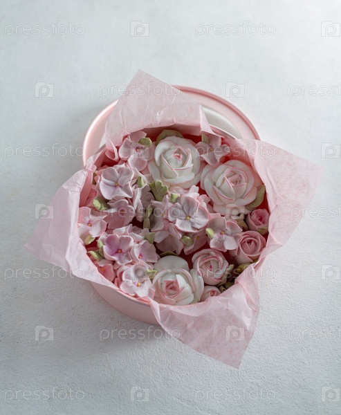 Зефирный букет цветов в розовой коробке на светлом фоне, вид сверху, пространство для копирования, концепция праздника