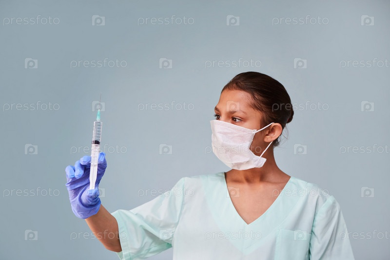 Девушка молодая медсестра или ассистент в медицинской одежде и маске