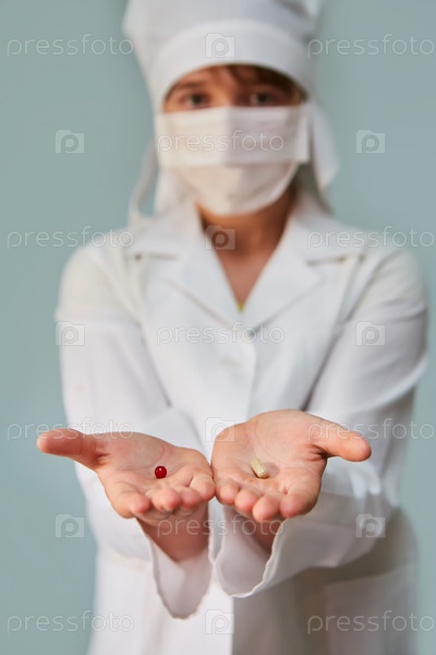 Две разные таблетки или витамины в руках у врача, варианты на выбор