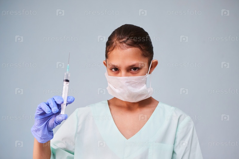 Девушка молодая медсестра или ассистент в медицинской одежде и маске