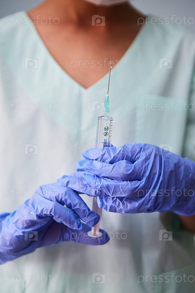 Медицинский шприц с лекарством в женских руках врача. Концепция вакцинации