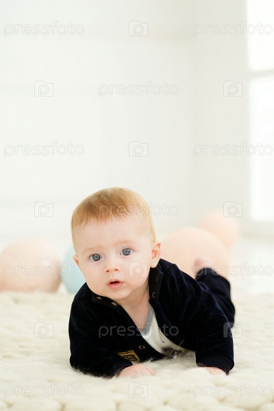 Младенец лежит на мягкой поверхности в светлой комнате, одетый в темную одежду. Концепция детства