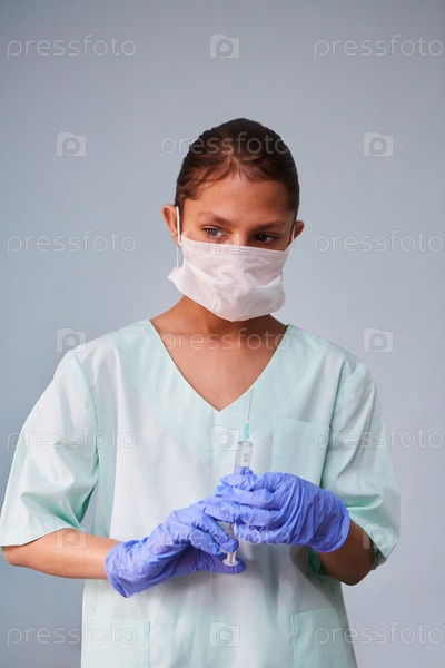 Девушка молодая медсестра или ассистент в медицинской одежде и маске