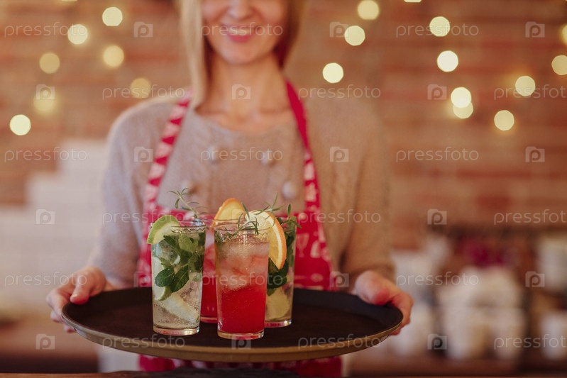 Улыбающаяся официантка в цветном фартуке держит поднос с алкогольными напитками и различными коктейлями