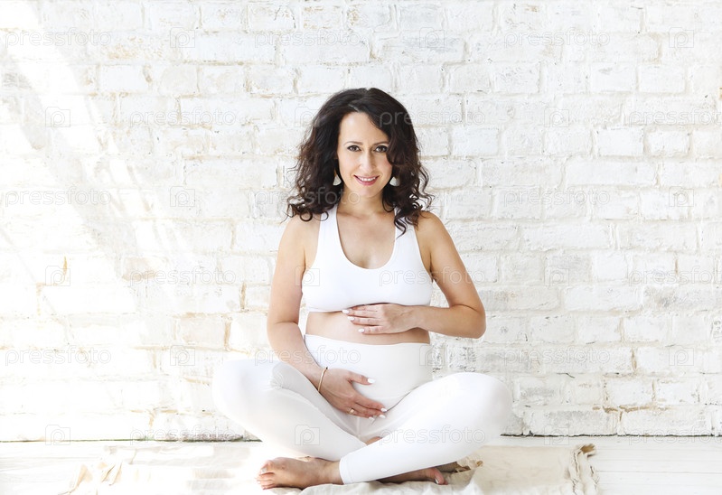 Красивая беременная женщина растягивается и занимается йогой дома