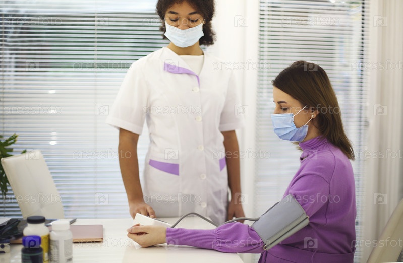 Врач измеряет артериальное давление беременной женщины, навещая ее дома,