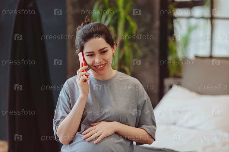 Молодая улыбающаяся беременная женщина трогает живот, разговаривая по мобильному телефону с другом, проводя время дома