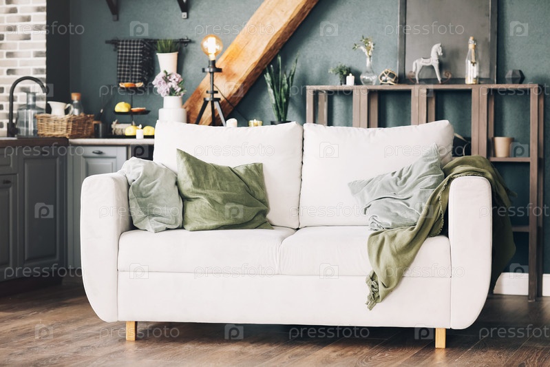 Белый диван с зелеными и серыми велюровыми подушками, стоящими в современном интерьере кухни в американском стиле