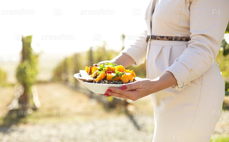Обрезанное фото неизвестной женщины, держащей закусочную тарелку с лебедой и блюдом из желтой тыквы снаружи